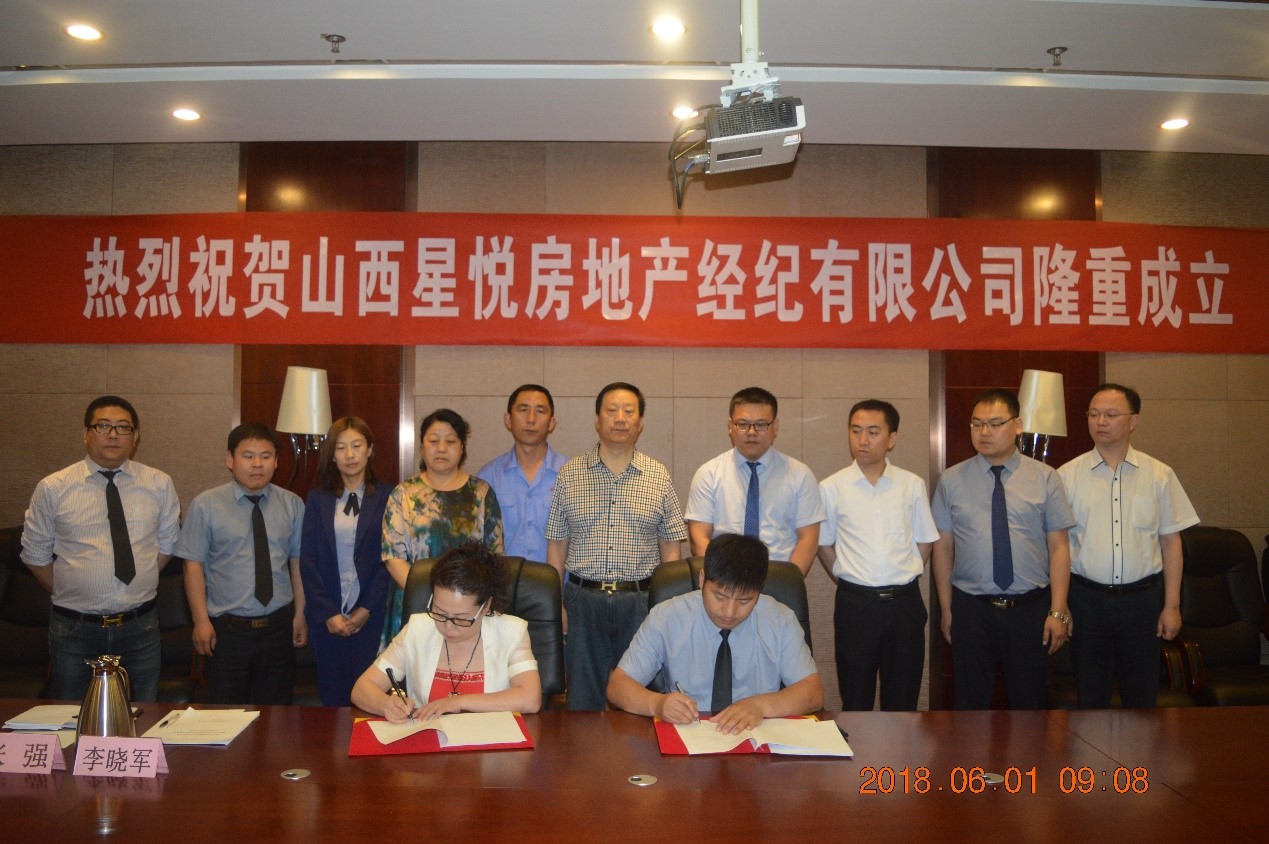 2018年6月1日上午9時(shí),“山西星悅房地產(chǎn)經(jīng)紀(jì)有限公司成立大會(huì)暨簽約儀式”在星雅名都酒店4樓會(huì)議廳隆重舉行。集團(tuán)董事長(zhǎng)總裁郭秀忠、副總裁王文萍、郭雅維、董事長(zhǎng)助理沈習(xí)寧、經(jīng)紀(jì)公司總經(jīng)理冉賢俊、監(jiān)事劉斌等領(lǐng)導(dǎo)出席了大會(huì)。