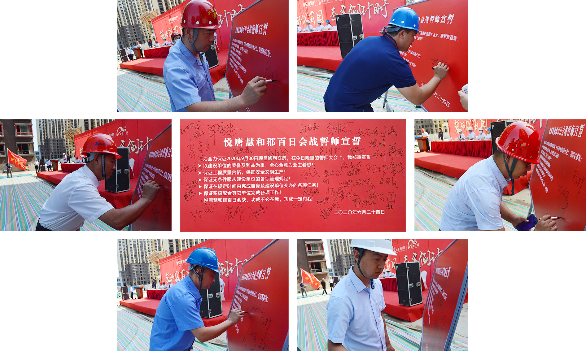 誓師戰(zhàn)百日,交房倒計時!為全力保證項目交房任務(wù)圓滿完成,嚴格兌現(xiàn)向廣大業(yè)主的承諾,2020年6月24日上午,山西悅唐房地產(chǎn)開發(fā)有限公司組織進行“施工現(xiàn)場觀摩檢查暨工程百日會戰(zhàn)誓師大會”。中維控股集團董事長郭秀忠先生、總裁郭雅磊先生,悅唐地產(chǎn)執(zhí)行總經(jīng)理郭改花女士、總工程師張強先生,以及項目各總包、監(jiān)理、分包單位負責人等主要領(lǐng)導,中維控股集團、各參建單位員工代表參與本次活動。