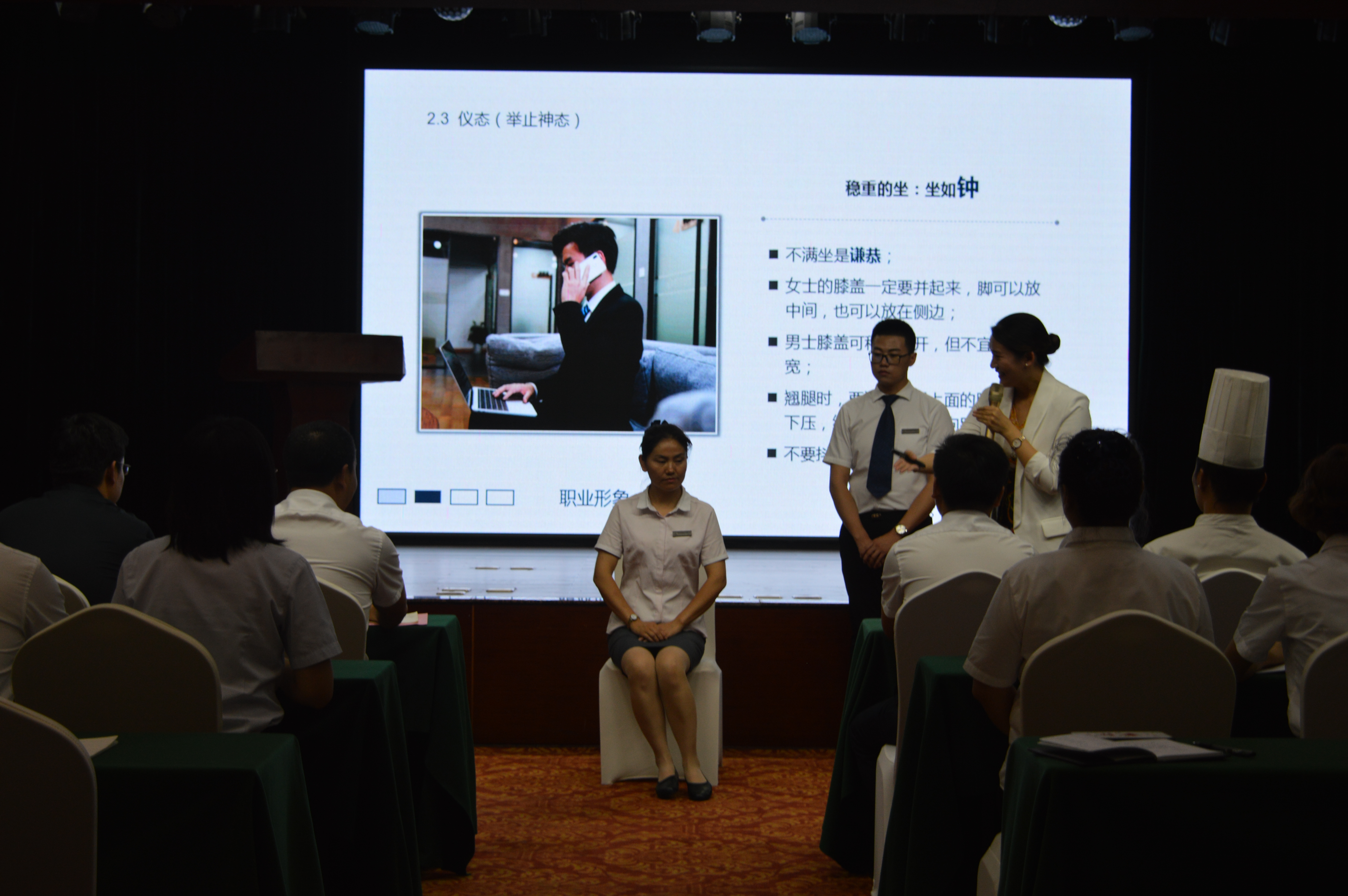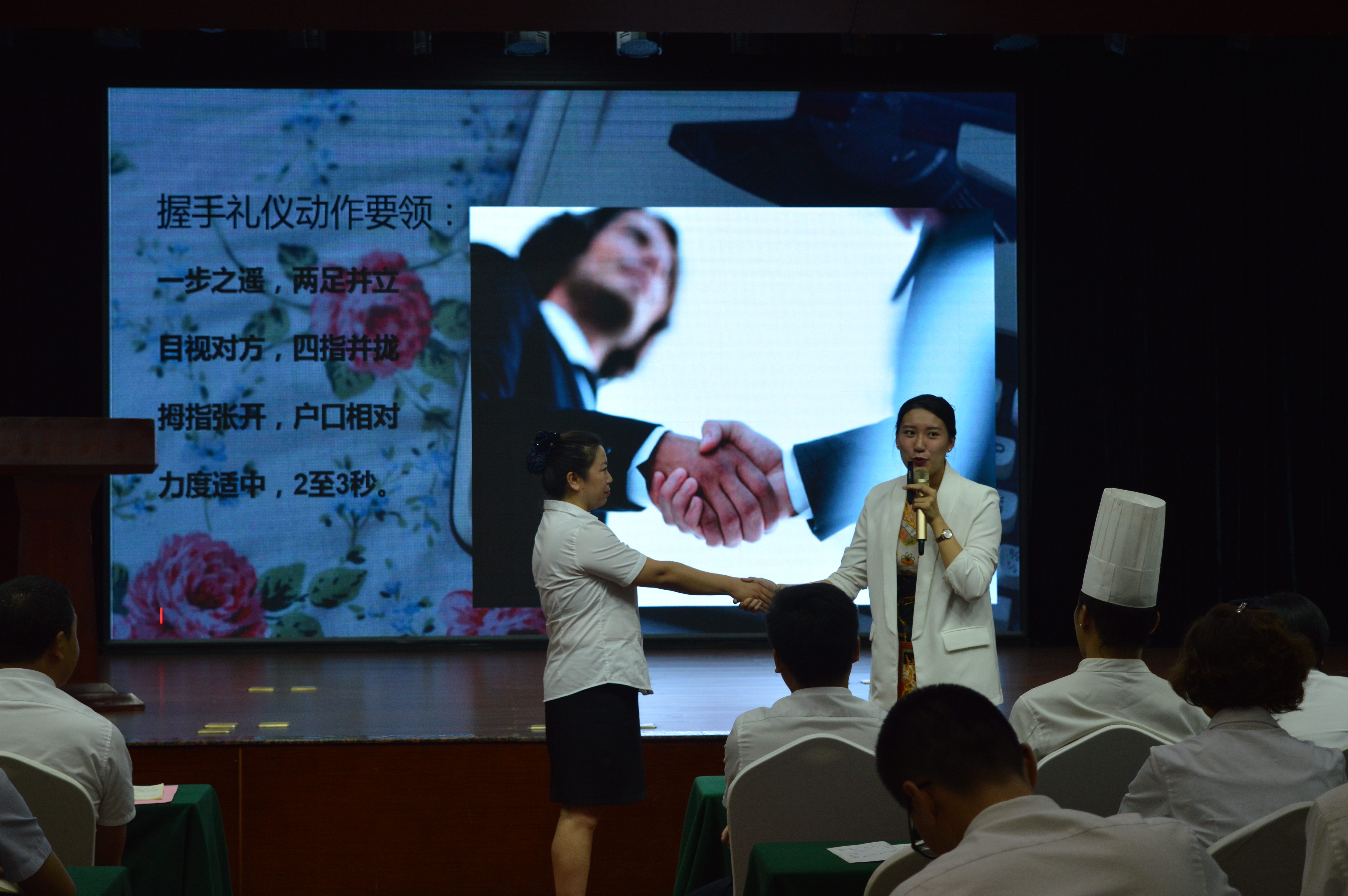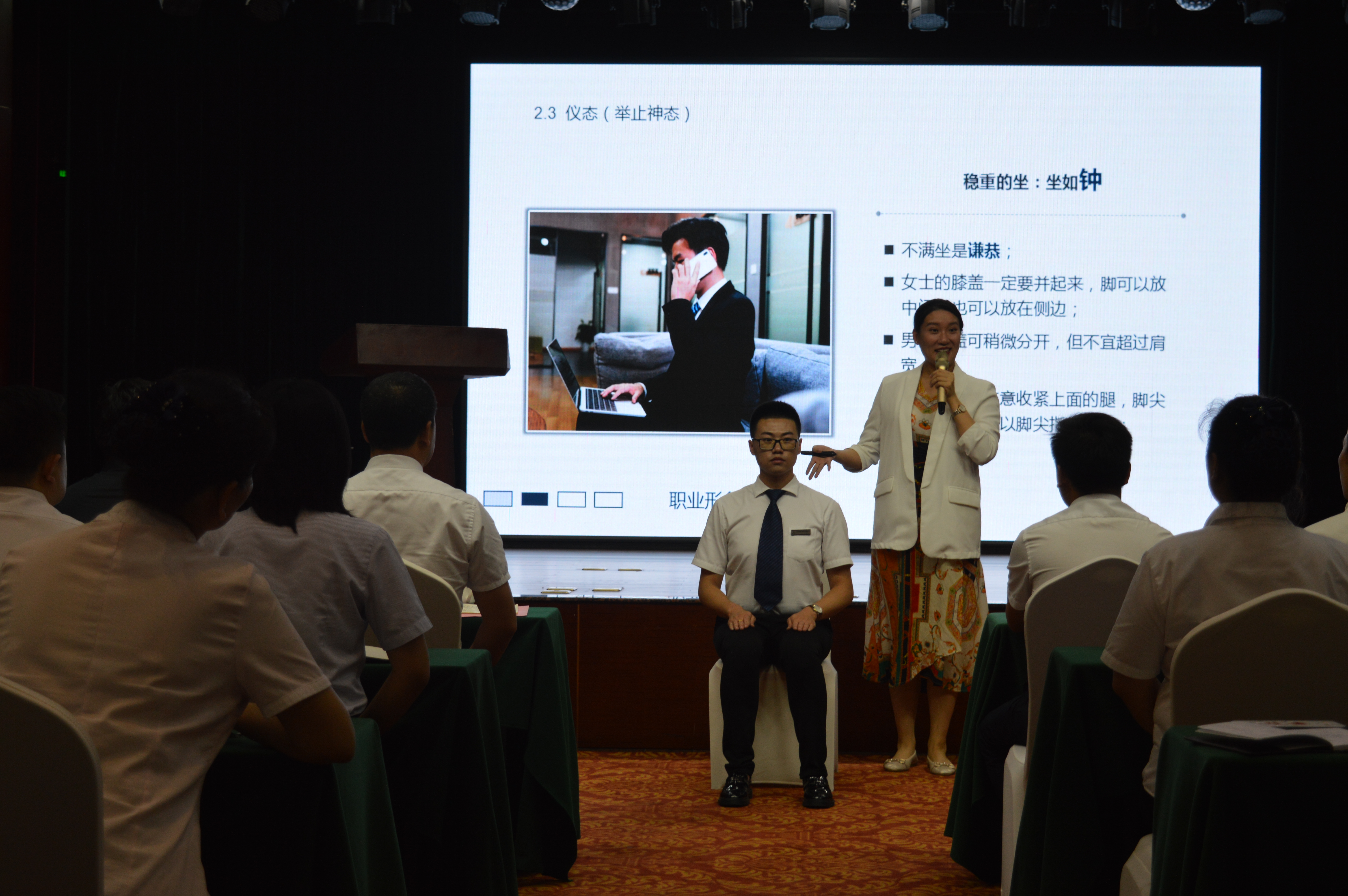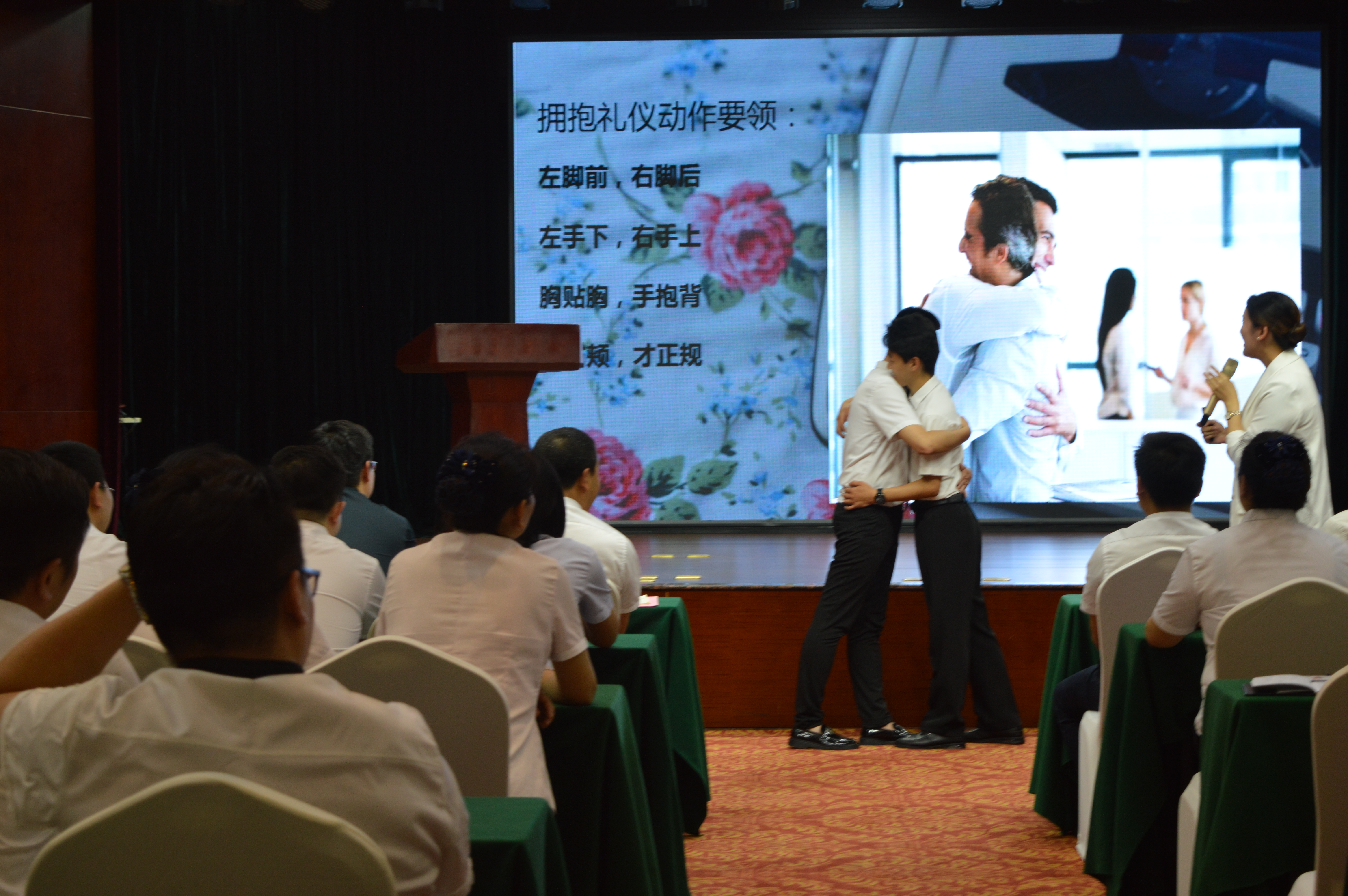嘉賓曹老師為大家進行了精彩而生動的服務禮儀培訓,曹老師從日常的儀表、站姿、坐姿、行走、擁抱、握手、鞠躬等禮儀規(guī)范方面,邀請現(xiàn)場員工互動參與并示范講解,另外通過案例與影片分享,闡釋了服務美學的重要意義,以及如何從基本的服務到滿意的服務再到感動的服務。現(xiàn)場教學氛圍活躍,精彩處引發(fā)陣陣掌聲。