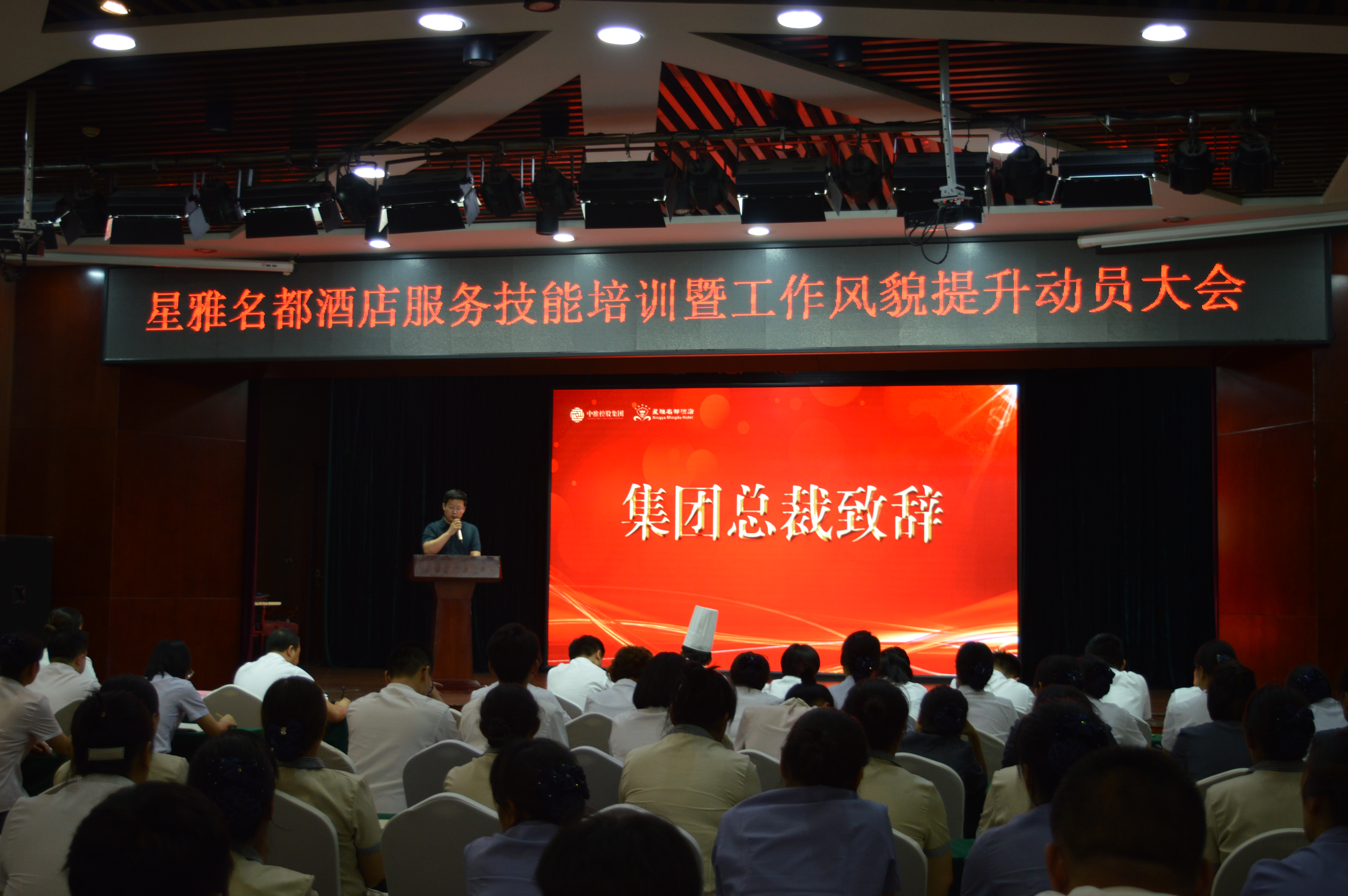 集團總裁郭雅磊向大會致辭,郭總對酒店服務品質提升及培訓工作的開展提出兩點部署:首先,要統(tǒng)一思想,提高認識,進一步增強責任感和使命感;其次,務必精心組織,強化措施,全力抓好服務技能培訓落實。酒店自今日起,要掀起一場轟轟烈烈的以“強化管理、提升服務”為主題的大培訓、大學習活動,通過培訓活動使大家的工作及精神面貌有明顯改觀、服務質量及員工整體素質強化提升、管理機制得到進一步加強與完善。最后,郭總向酒店全員發(fā)出號召,希望全體星雅人攜起手來,臥薪嘗膽刻苦鉆研、勠力同心共克時艱,重塑星雅酒店輝煌,共同開拓星雅酒店更加美好的明天!