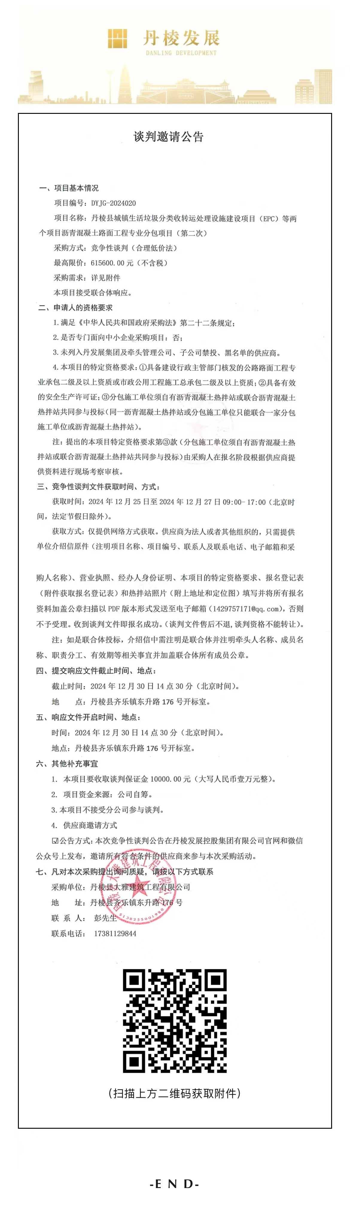 丹棱縣城鎮(zhèn)生活垃圾分類收轉(zhuǎn)運(yùn)處理設(shè)施建設(shè)項目(EPC)等兩個項目瀝青混凝土路面工程專業(yè)分包項目(第二次)談判邀請公告