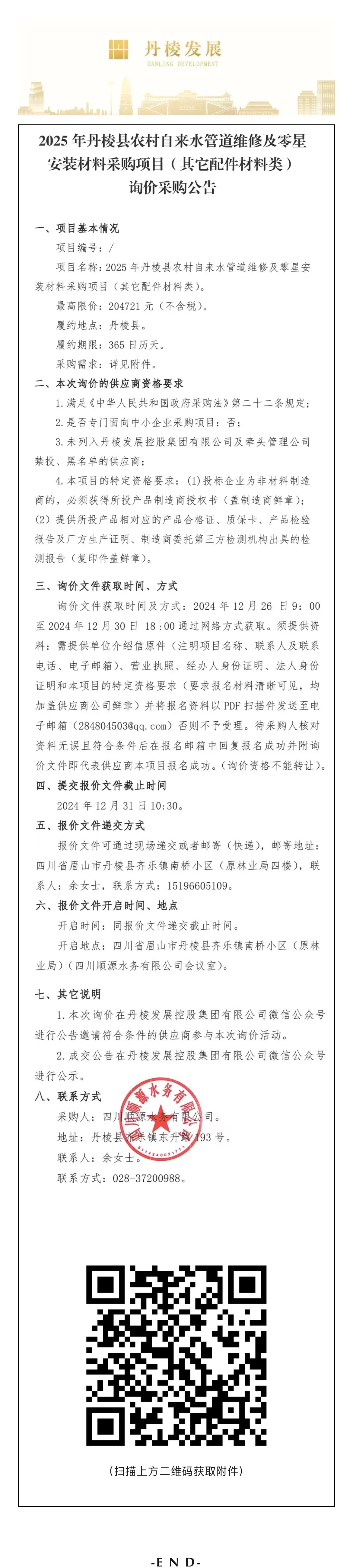 2025年丹棱縣農(nóng)村自來(lái)水管道維修及零星安裝材料采購(gòu)項(xiàng)目(其他配件材料類)詢價(jià)采購(gòu)公告