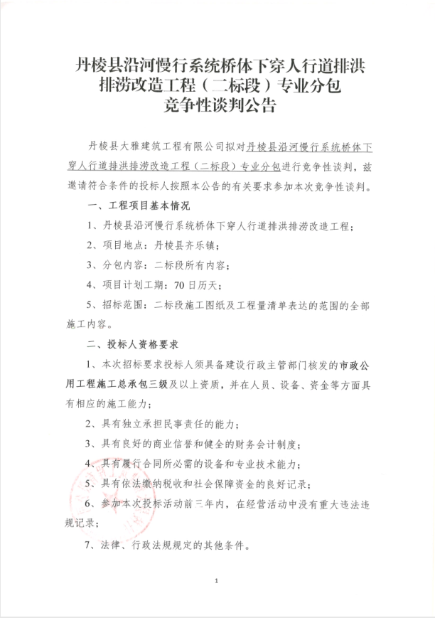 【大雅建筑公司】丹棱縣沿河慢行系統(tǒng)橋體下穿人行道排洪排澇改造工程(二標段)專業(yè)分包競爭性談判公告