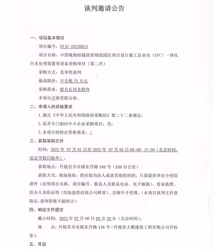 中國晚熟柑橘商貿(mào)物流園區(qū)項(xiàng)目設(shè)計(jì)施工總承包(EPC)一體化污水處理裝置等設(shè)備采購項(xiàng)目第二次談判邀請(qǐng)公告