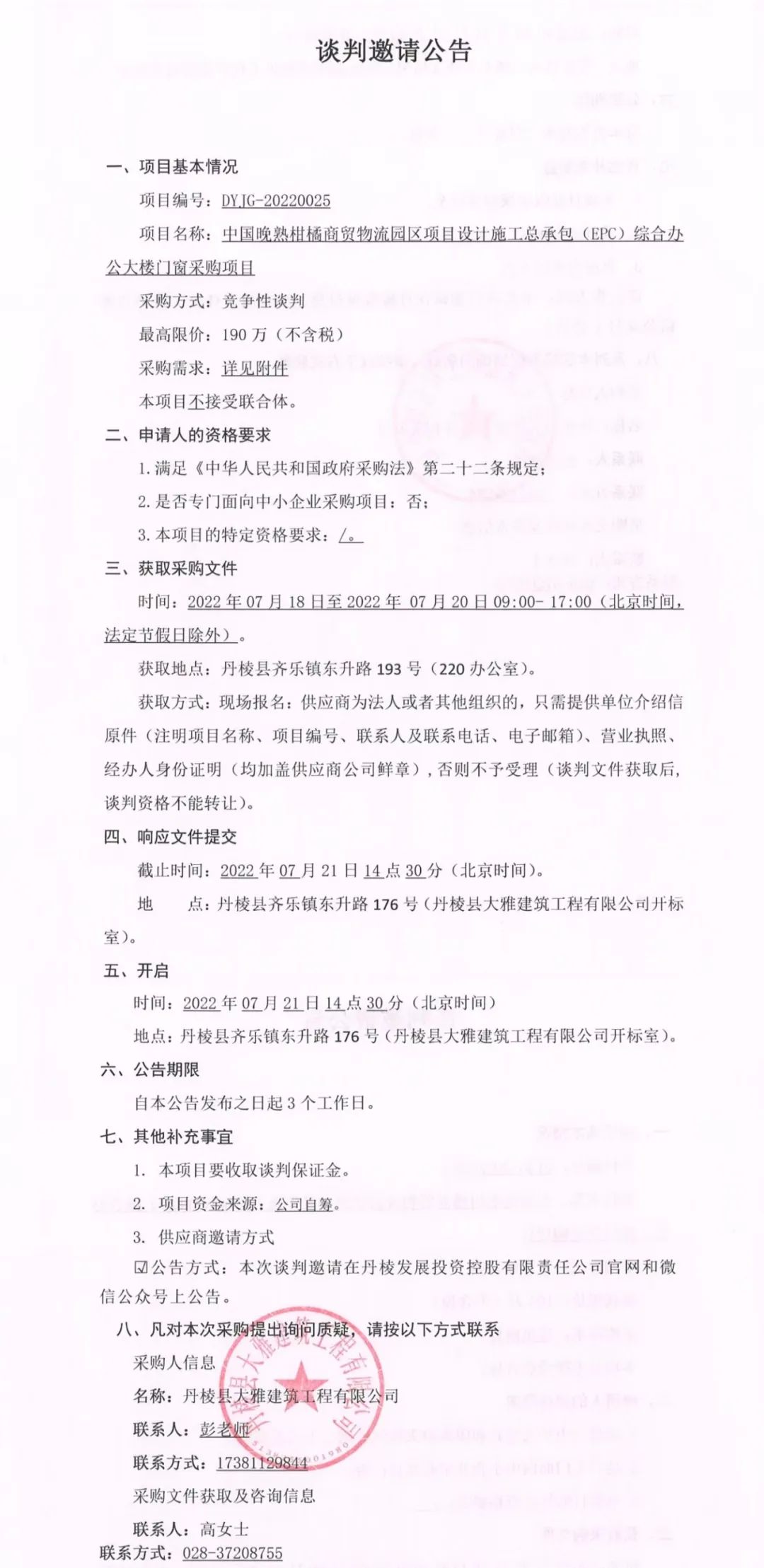 中國晚熟柑橘商貿(mào)物流園區(qū)項目設計施工總承包(EPC)綜合辦公大樓門窗采購項目談判邀請公告