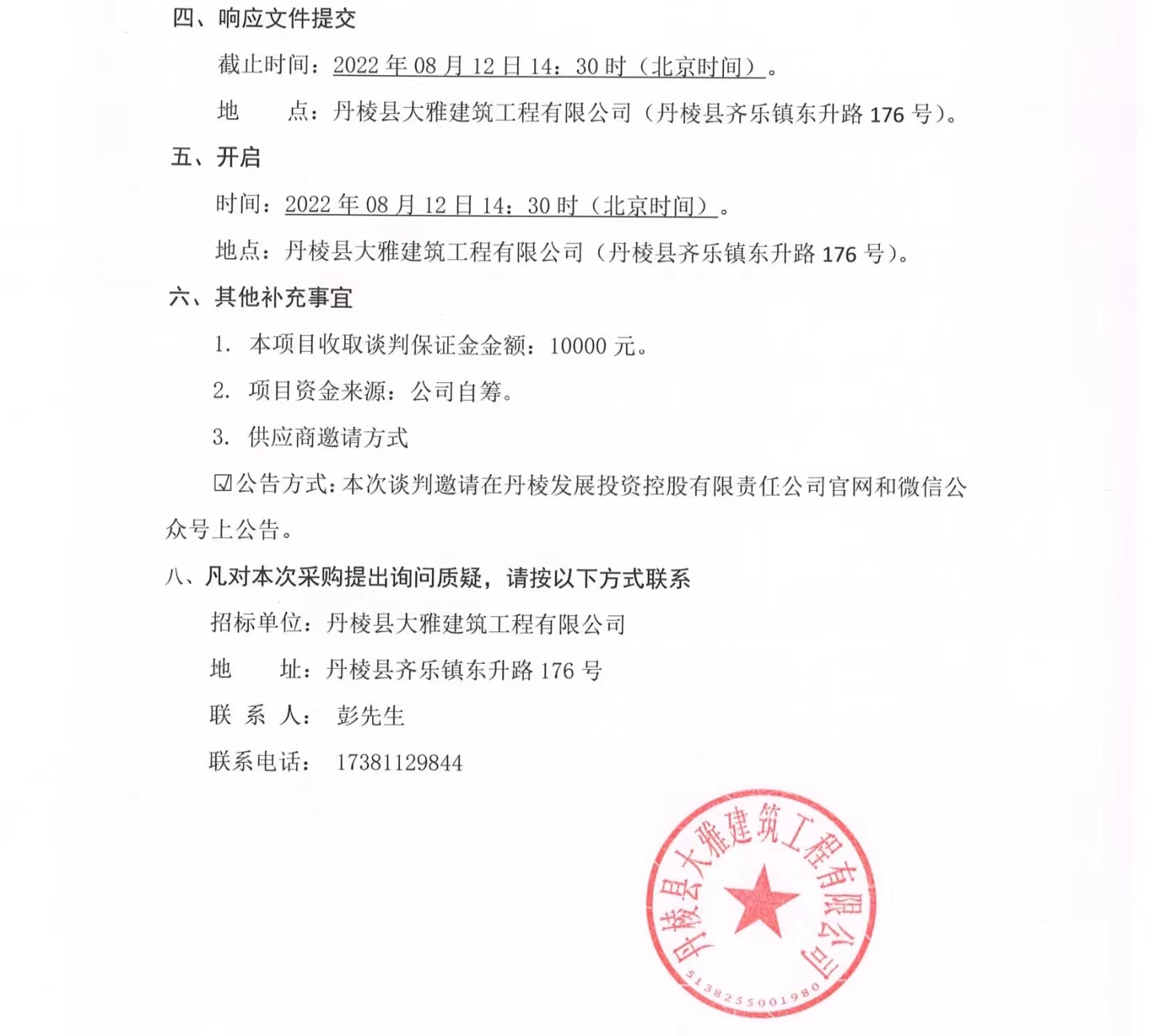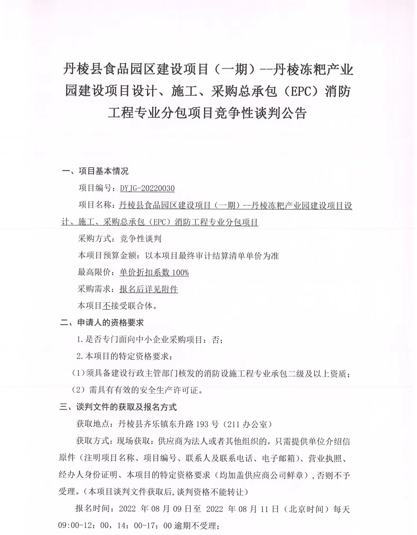 丹棱縣食品園區(qū)建設(shè)項(xiàng)目(一期)--丹棱凍粑產(chǎn)業(yè)園建設(shè)項(xiàng)目設(shè)計(jì)、施工、采購(gòu)總承包(EPC)消防工程專業(yè)分包項(xiàng)目競(jìng)爭(zhēng)性談判公告