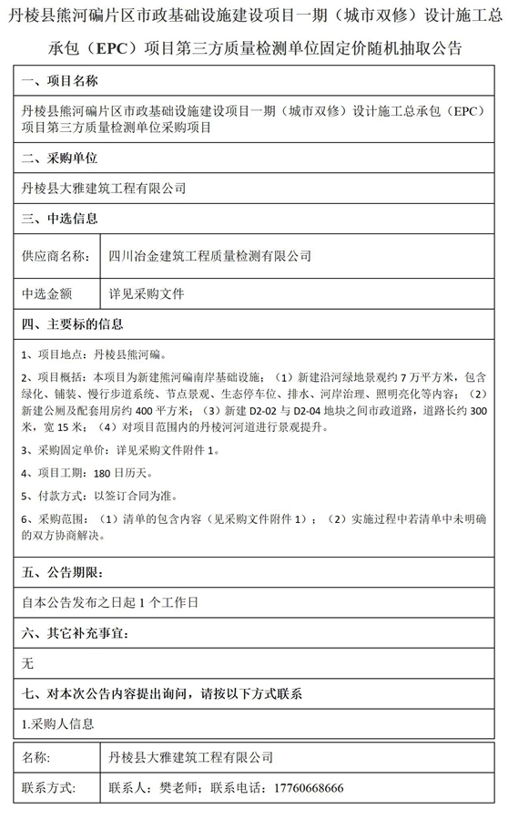 丹棱縣熊河碥片區(qū)市政基礎(chǔ)設(shè)施建設(shè)項(xiàng)目一期(城市雙修)設(shè)計(jì)施工總承包(EPC)項(xiàng)目第三方質(zhì)量檢測單位固定價隨機(jī)抽取公告
