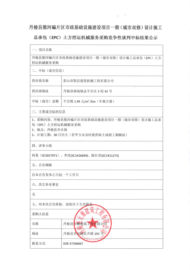 丹棱縣熊河碥片區(qū)市政基礎設施建設項目一期(城市雙修)設計施工 總承包(EPC)土方挖運機械服務采購競爭性談判中標結果公示