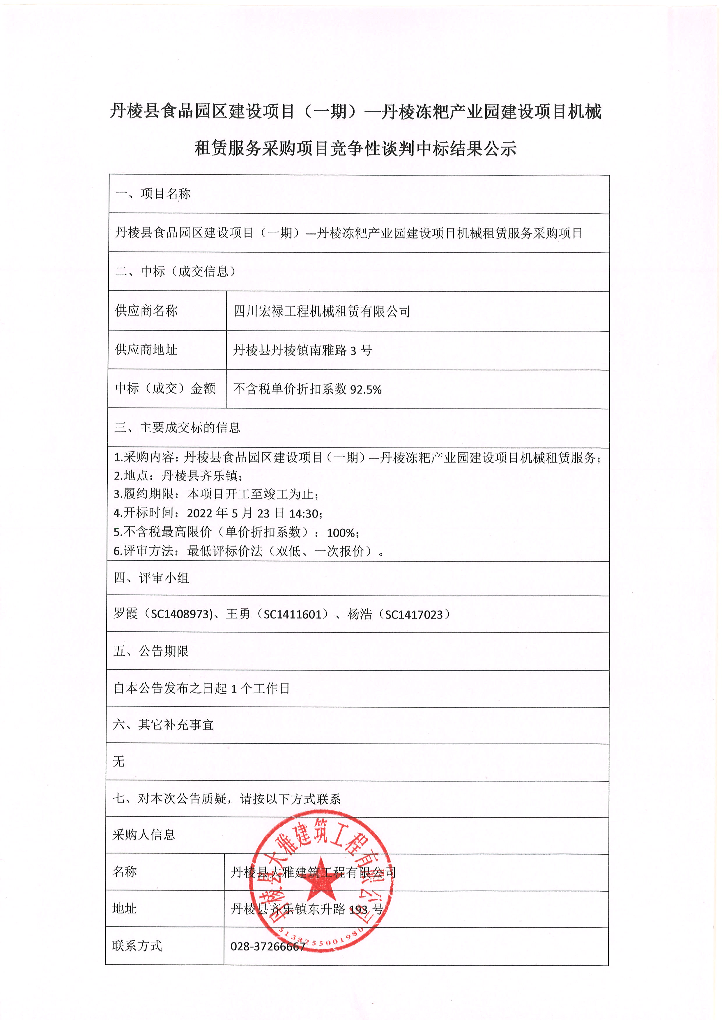 丹棱縣食品園區(qū)建設(shè)項目(一期)-丹棱凍粑產(chǎn)業(yè)園建設(shè)項目機(jī)械 租賃服務(wù)采購項目競爭性談判中標(biāo)結(jié)果公示