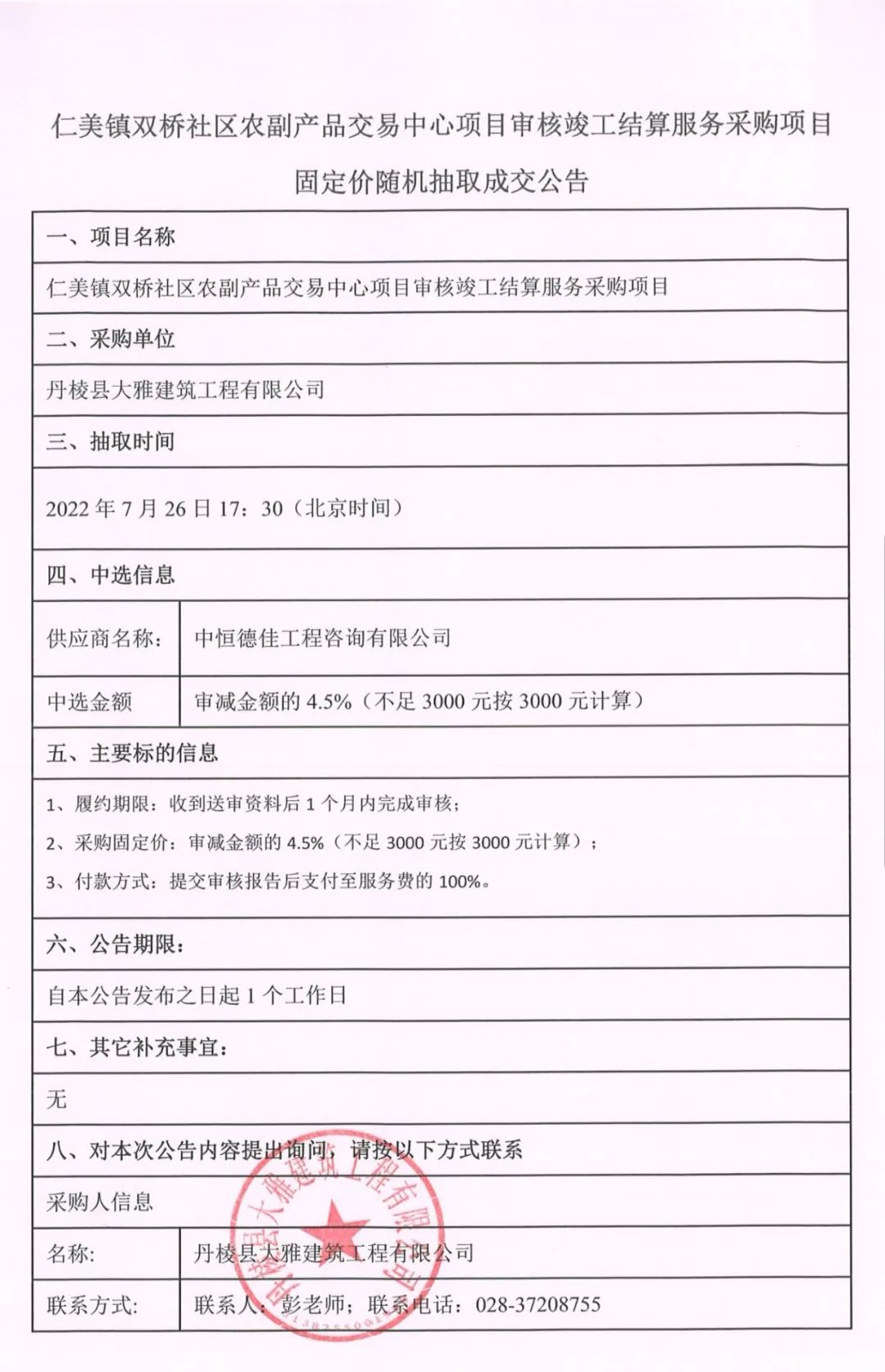 仁美鎮(zhèn)雙橋社區(qū)農(nóng)副產(chǎn)品交易中心項目審核竣工結(jié)算服務(wù)采購項目固定價隨機抽取成交公告
