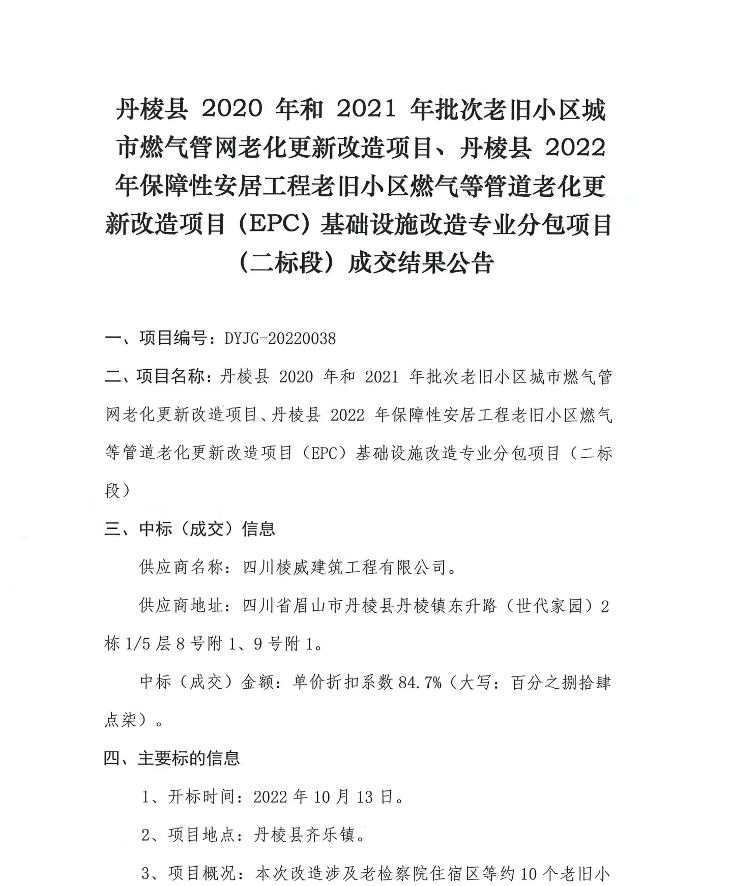 丹棱縣2020年、2021年和2022年老舊小區(qū)城市燃氣管網(wǎng)老化更新改造項目基礎(chǔ)設(shè)施改造專業(yè)分包項目(二標(biāo)段)成交結(jié)果公告