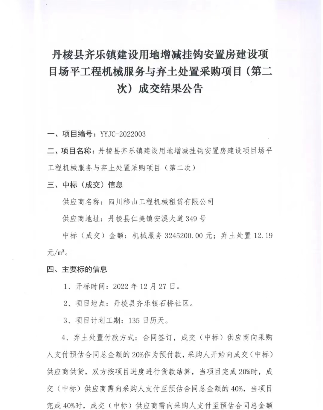 丹棱縣齊樂(lè)鎮(zhèn)建設(shè)用地增減掛鉤安置房建設(shè)項(xiàng)目場(chǎng)平工程機(jī)械服務(wù)與棄土處置采購(gòu)項(xiàng)目(第二次)成交結(jié)果公告