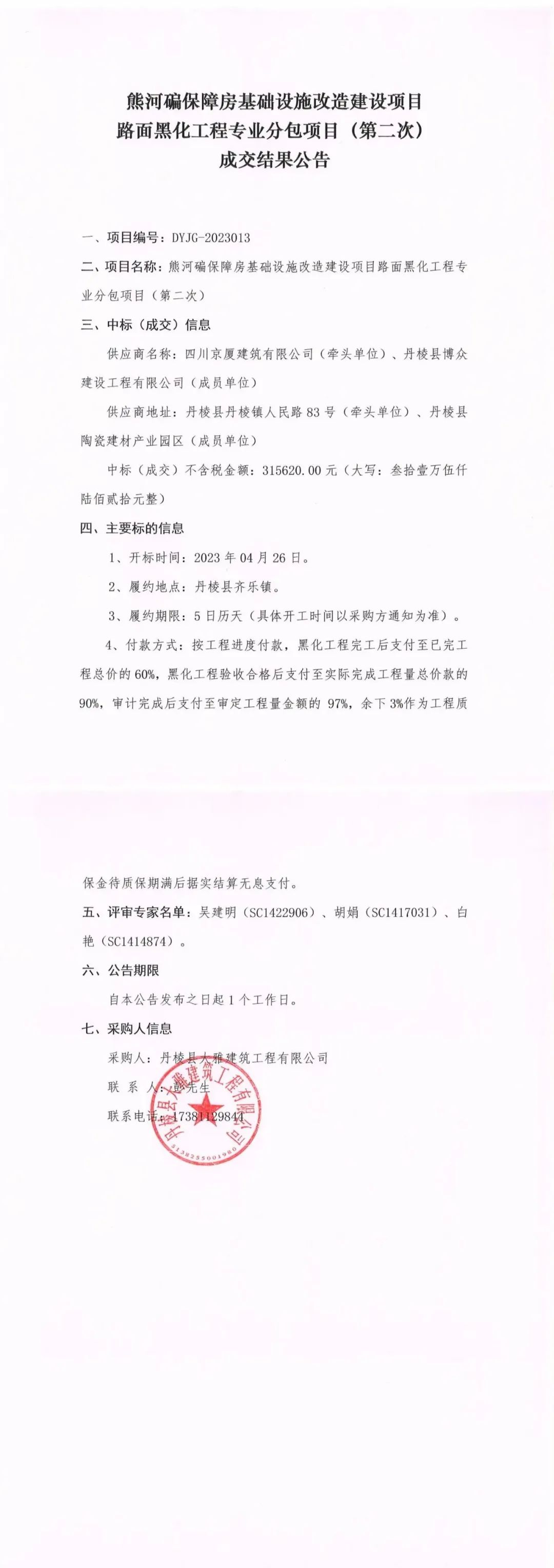 熊河碥保障房基礎(chǔ)設(shè)施改造建設(shè)項目路面黑化工程專業(yè)分包項目 (第二次)成交結(jié)果公告