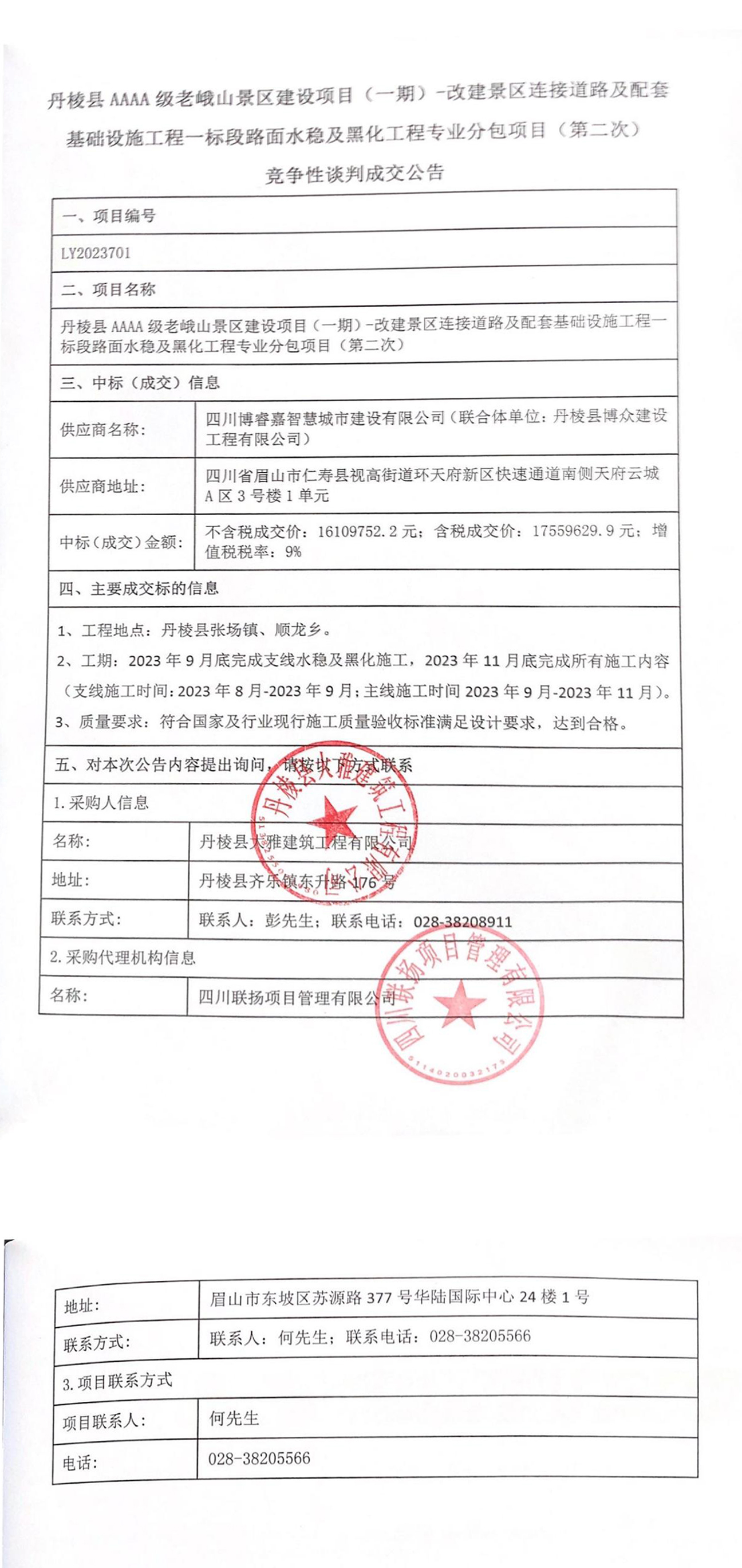 丹棱縣AAAA級老峨山景區(qū)建設項目(一期)—改建景區(qū)連接道路及配套基礎設施工程一標段路面水穩(wěn)及黑化工程專業(yè)分包項目成交公告
