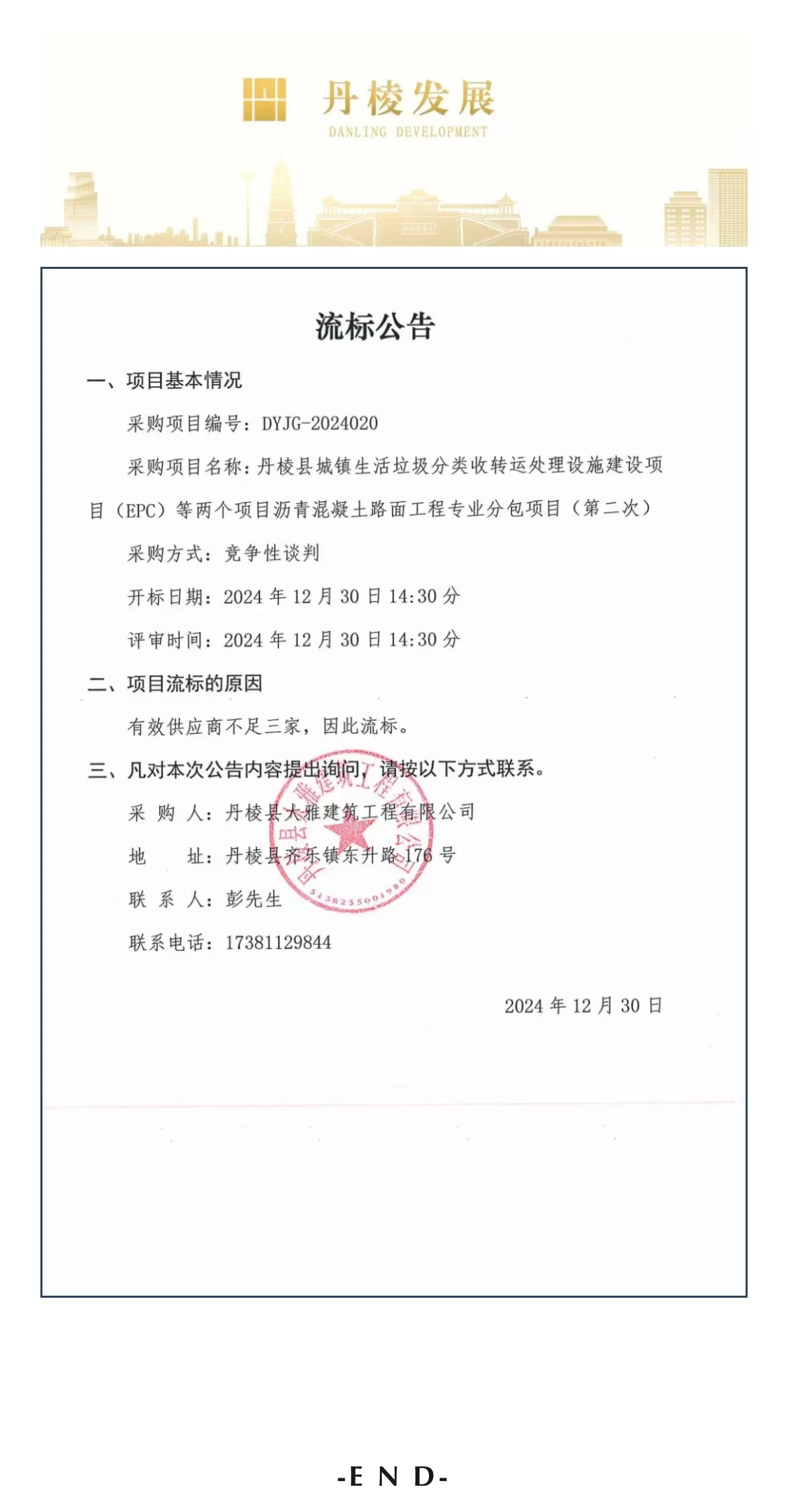 丹棱縣城鎮(zhèn)生活垃圾分類收轉(zhuǎn)運(yùn)處理設(shè)施建設(shè)項目(EPC)等兩個項目瀝青混凝土路面工程專業(yè)分包項目(第二次)流標(biāo)公告