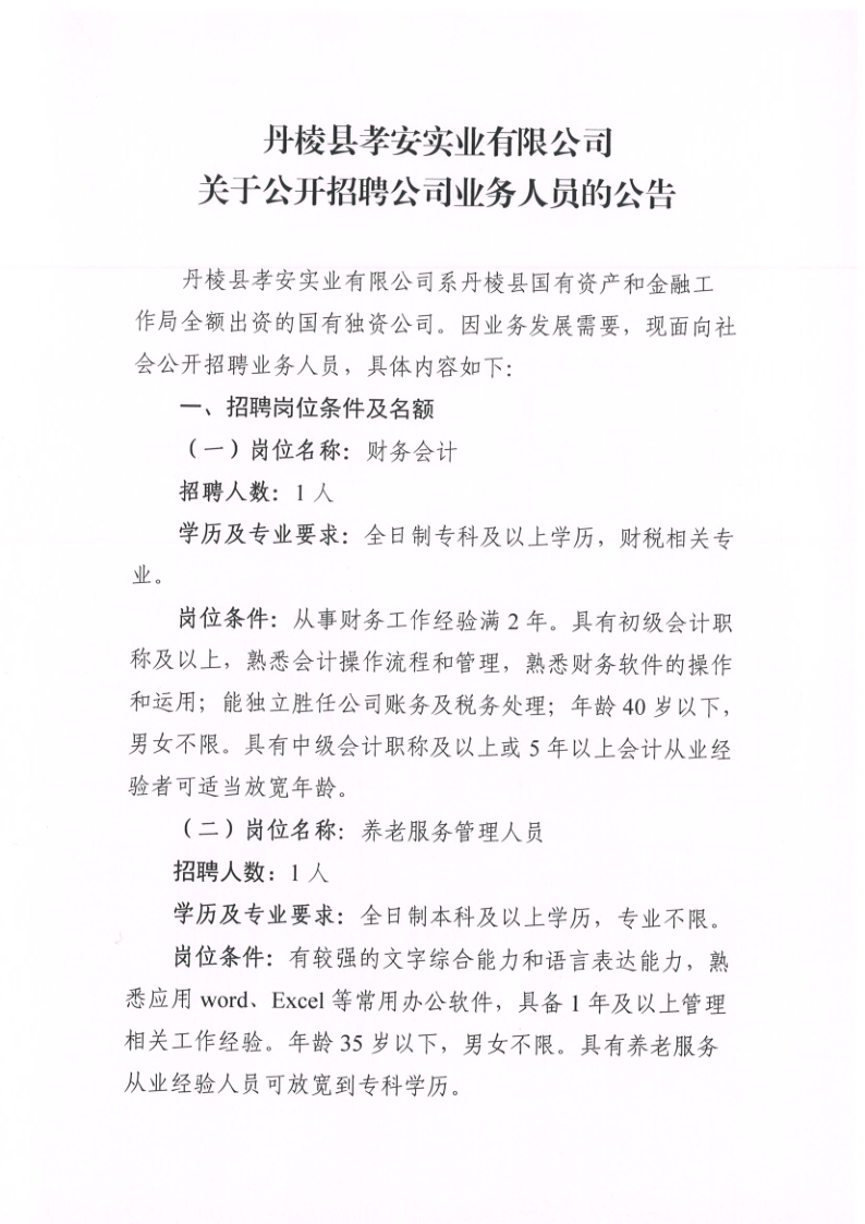 【縣孝安公司】丹棱縣孝安實(shí)業(yè)有限公司關(guān)于公開招聘公司業(yè)務(wù)人員的公告