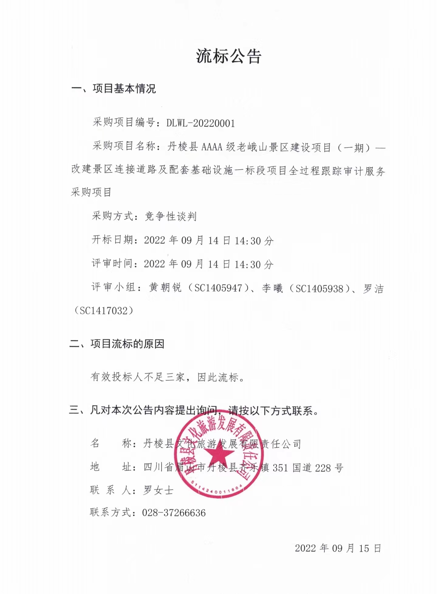 丹棱縣AAAA級老峨山景區(qū)建設(shè)項目(一期)--改建景區(qū)連接道路及配套基礎(chǔ)設(shè)施一標段項目全過程跟蹤審計服務(wù)采購項目流標公告