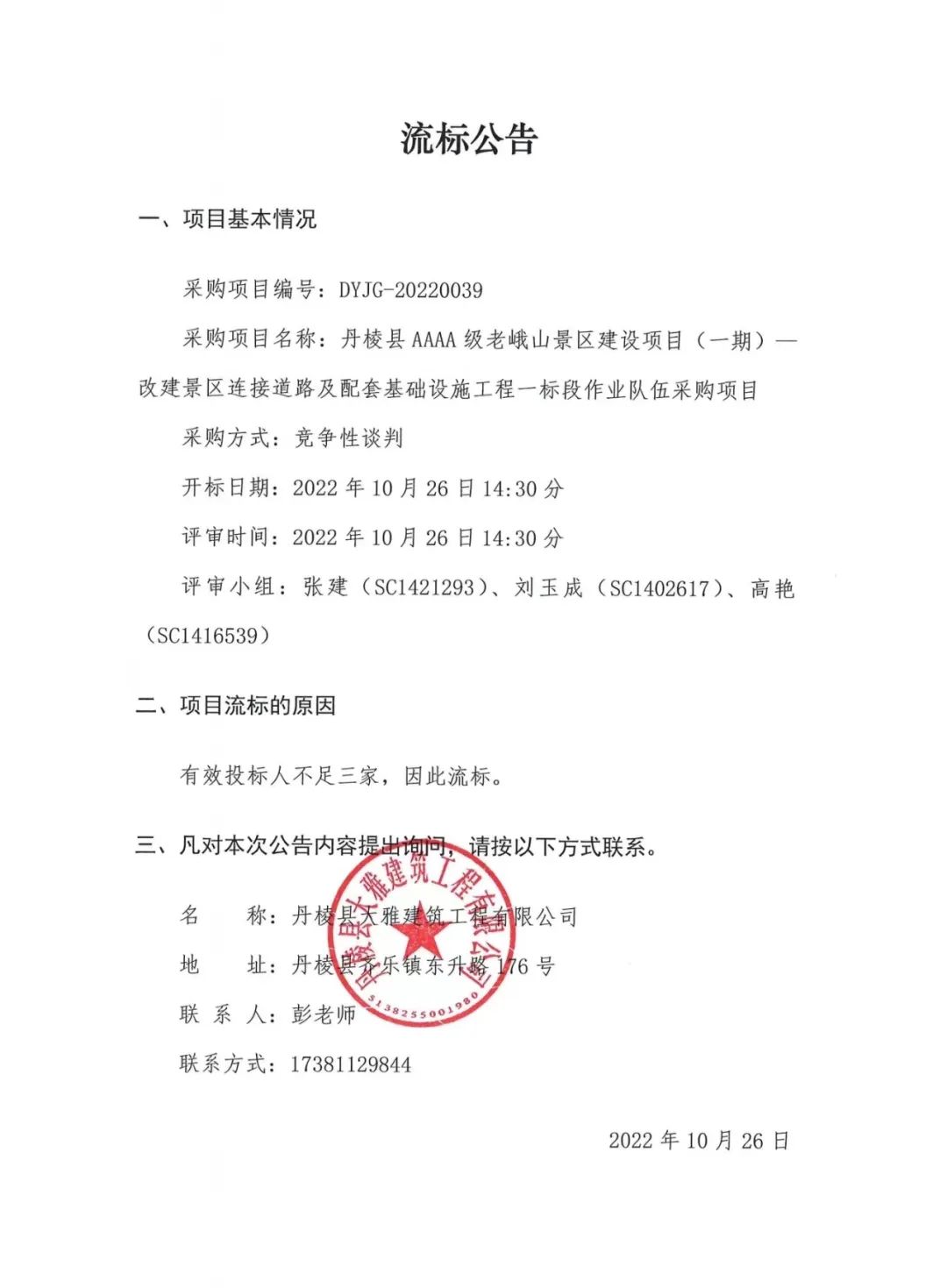 丹棱縣AAAA級(jí)老峨山景區(qū)建設(shè)項(xiàng)目(一期)--改建景區(qū)連接道路及配套基礎(chǔ)設(shè)施工程一標(biāo)段作業(yè)隊(duì)伍采購項(xiàng)目流標(biāo)公告