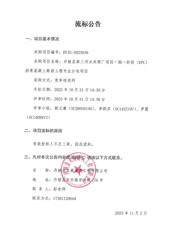 丹棱縣第三污水處理廠項(xiàng)目一期一階段(EPC)瀝青混凝土路面工程專業(yè)分包項(xiàng)目流標(biāo)公告