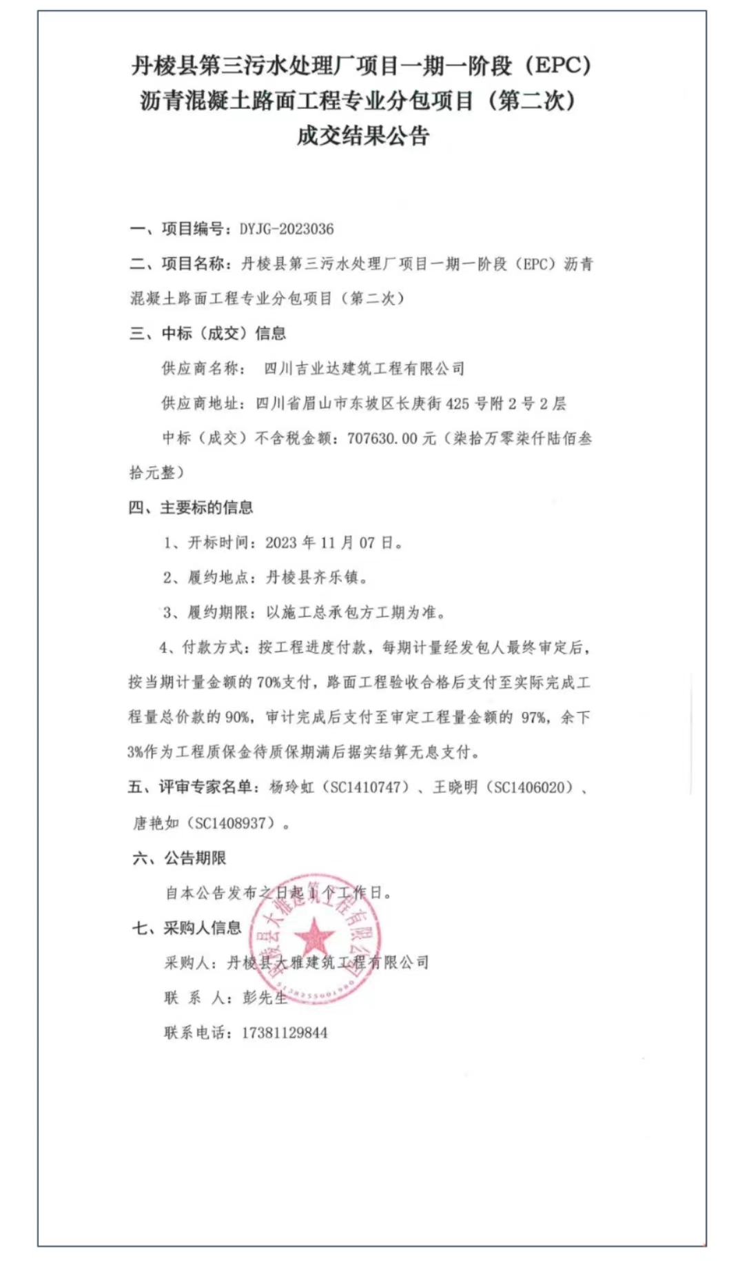 丹棱縣第三污水處理廠項(xiàng)目一期一階段(EPC)瀝青混凝土路面工程專(zhuān)業(yè)分包項(xiàng)目(第二次)成交結(jié)果公告