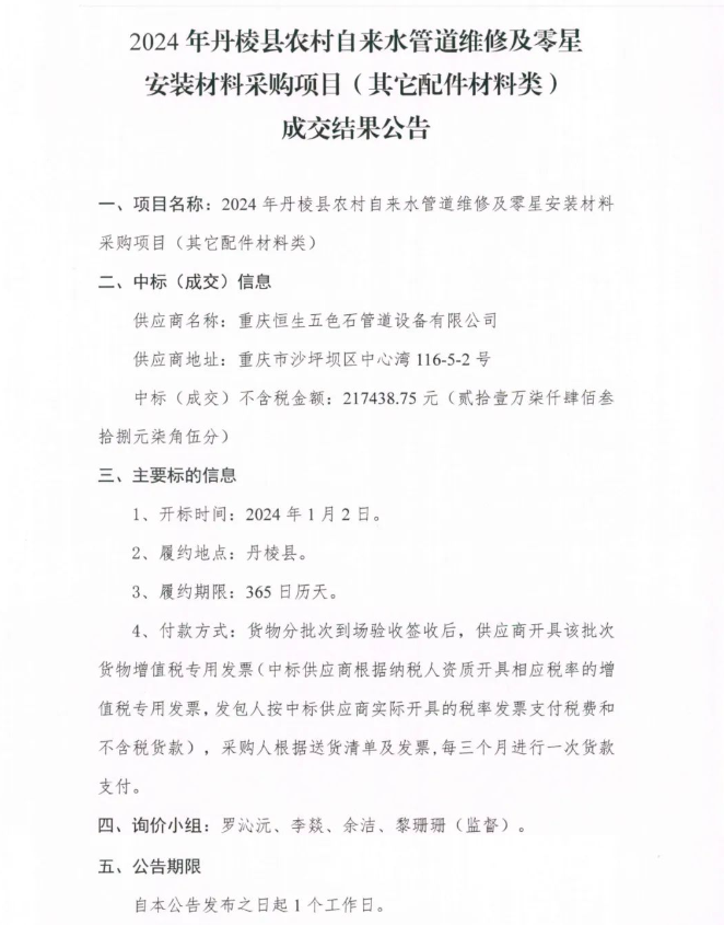2024年丹棱縣農(nóng)村自來水管道維修及零星安裝材料采購項目 (其它配件材料類 )成交結(jié)果公告