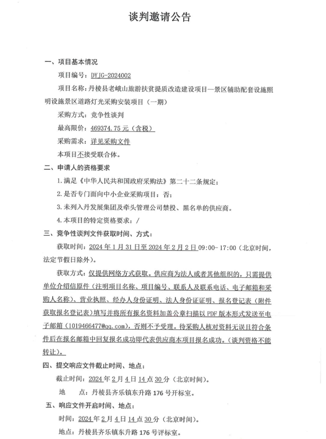 丹棱縣老峨山旅游扶貧提質(zhì)改造建設(shè)項(xiàng)目——景區(qū)輔助配套設(shè)施照明設(shè)施景區(qū)道路燈光采購(gòu)安裝項(xiàng)目(一期)談判邀請(qǐng)公告