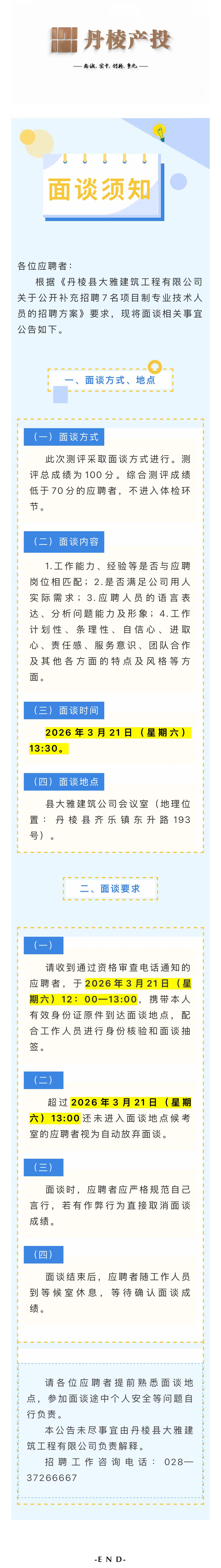 丹棱縣大雅建筑工程有限公司關(guān)于公開(kāi)補(bǔ)充招聘7名項(xiàng)目制專(zhuān)業(yè)技術(shù)人員的面談須知