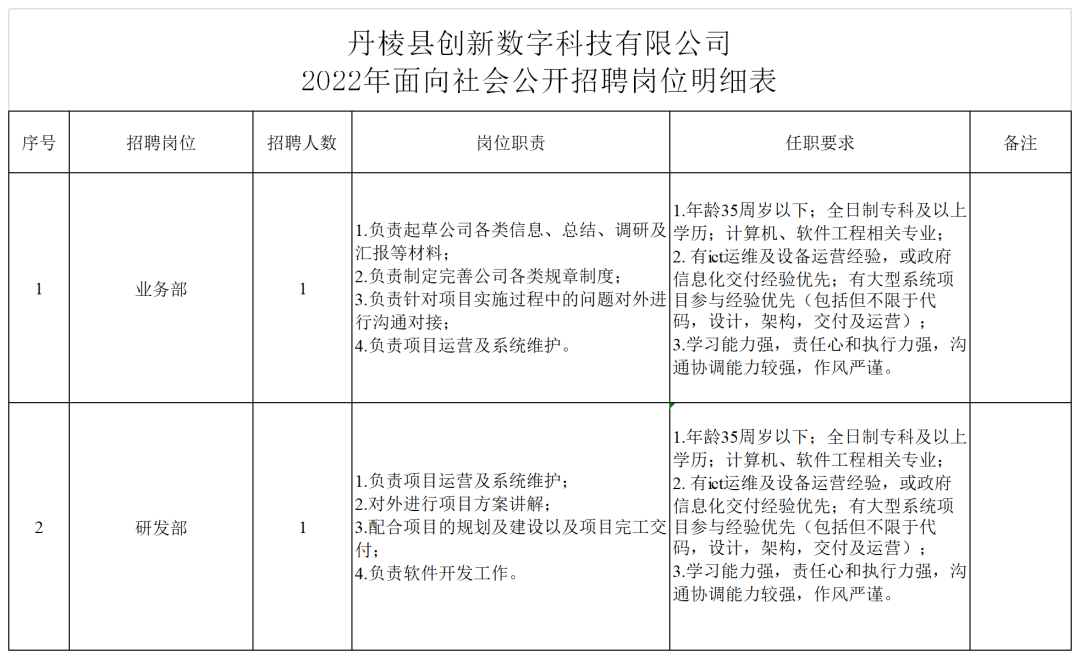 招聘崗位的學(xué)歷、專業(yè)、資歷、年齡等資格條件詳見(jiàn)附件《丹棱縣創(chuàng)新數(shù)字科技有限公司2022年面向社會(huì)公開(kāi)招聘崗位明細(xì)表》。