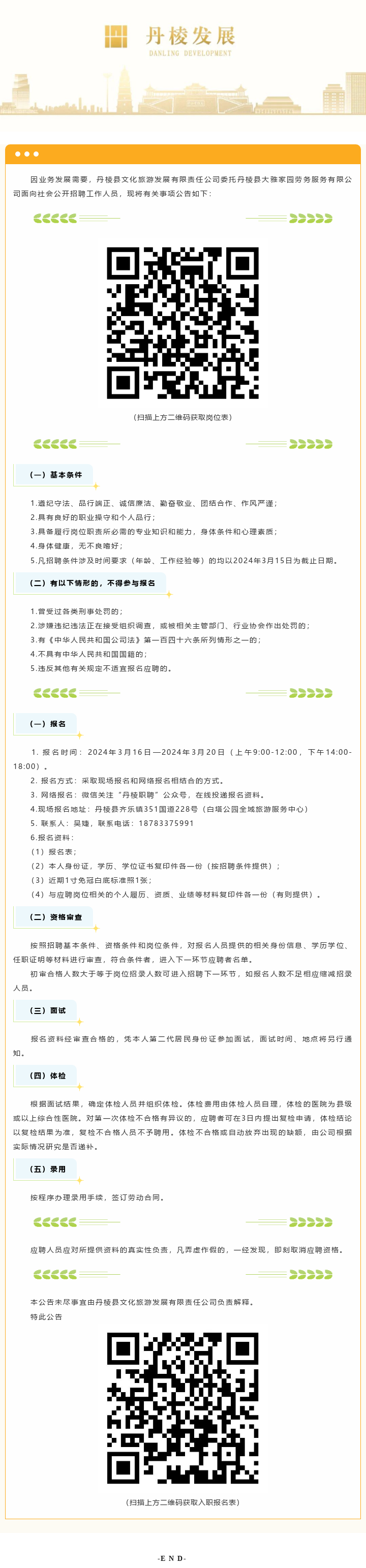 丹棱縣大雅家園勞務(wù)服務(wù)有限公司關(guān)于為丹棱縣文化旅游發(fā)展有限責任公司公開招聘32名勞務(wù)派遣人員的公告
