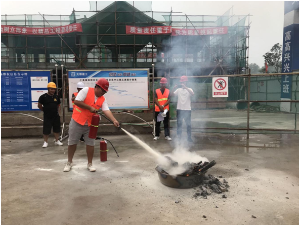 演練模擬施工現(xiàn)場材料堆場模板燃燒引起火災(zāi),項目現(xiàn)場人員發(fā)現(xiàn)火情,立即向項目管理人員報告,管理人員立即啟動《施工生產(chǎn)現(xiàn)場火災(zāi)事故應(yīng)急救援預(yù)案》。不到2分鐘,疏散引導(dǎo)組將火災(zāi)現(xiàn)場被困人員全部安全有序疏散到了安全地帶,同時,保衛(wèi)警戒組做好巡邏檢查工作,禁止無關(guān)人員進入危險區(qū)域,消防滅火組及時進場切斷火災(zāi)現(xiàn)場的電源,迅速利用干粉滅火器進行滅火。整個演練過程,組織得力,秩序井然。