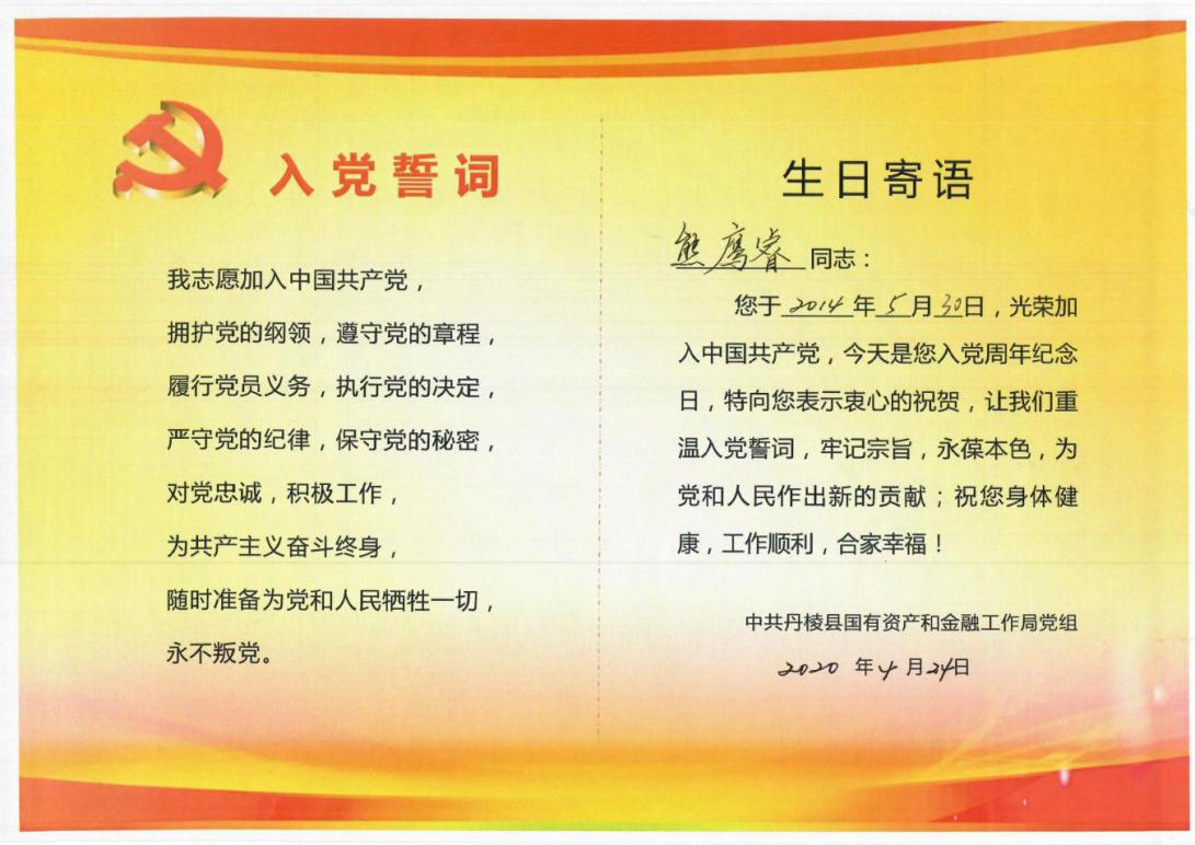 工作安排后,縣國資金融局黨組集體為5月入黨黨員過政治生日,縣國資金融局(縣金融服務(wù)中心)副主任茍永慶同志為“過生日”的黨員們送上精心制作的“黨員政治生日卡”,勉勵黨員同志要“常思入黨初衷、銘記入黨誓詞、牢記黨員義務(wù)”,發(fā)揮黨員先鋒模范作用,在今后的工作中不斷創(chuàng)先爭優(yōu),做好表率;顒幼詈,全體黨員同志在縣國資金融局黨組成員、副局長潘國榮同志的帶領(lǐng)下重溫入黨誓詞、面對黨旗莊嚴(yán)宣誓。